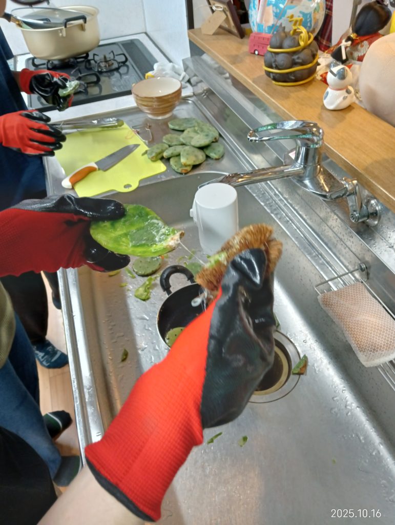がんばって、皮をむくみなさん…でも最初手袋をしないで皮をむいたら…